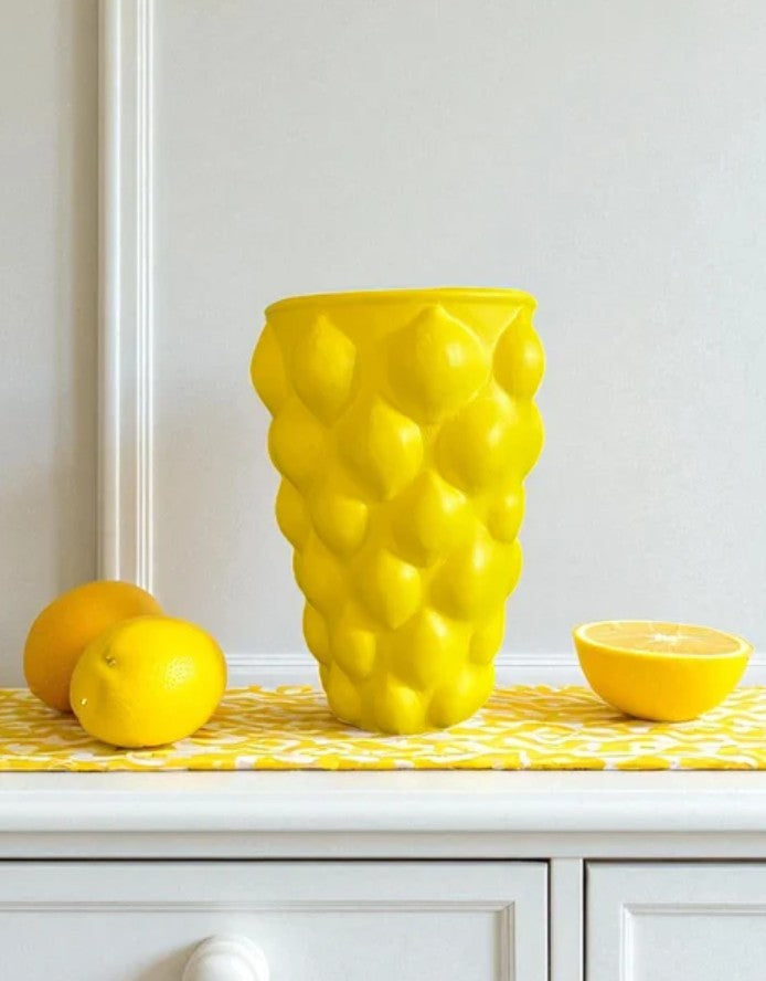 This handmade ceramic lemon vase brings a burst of sunshine and freshness into any room. With its bold yellow color and raised lemon-texture pattern, it creates an eye-catching accent perfect for kitchens, living rooms, or summer-themed décor.