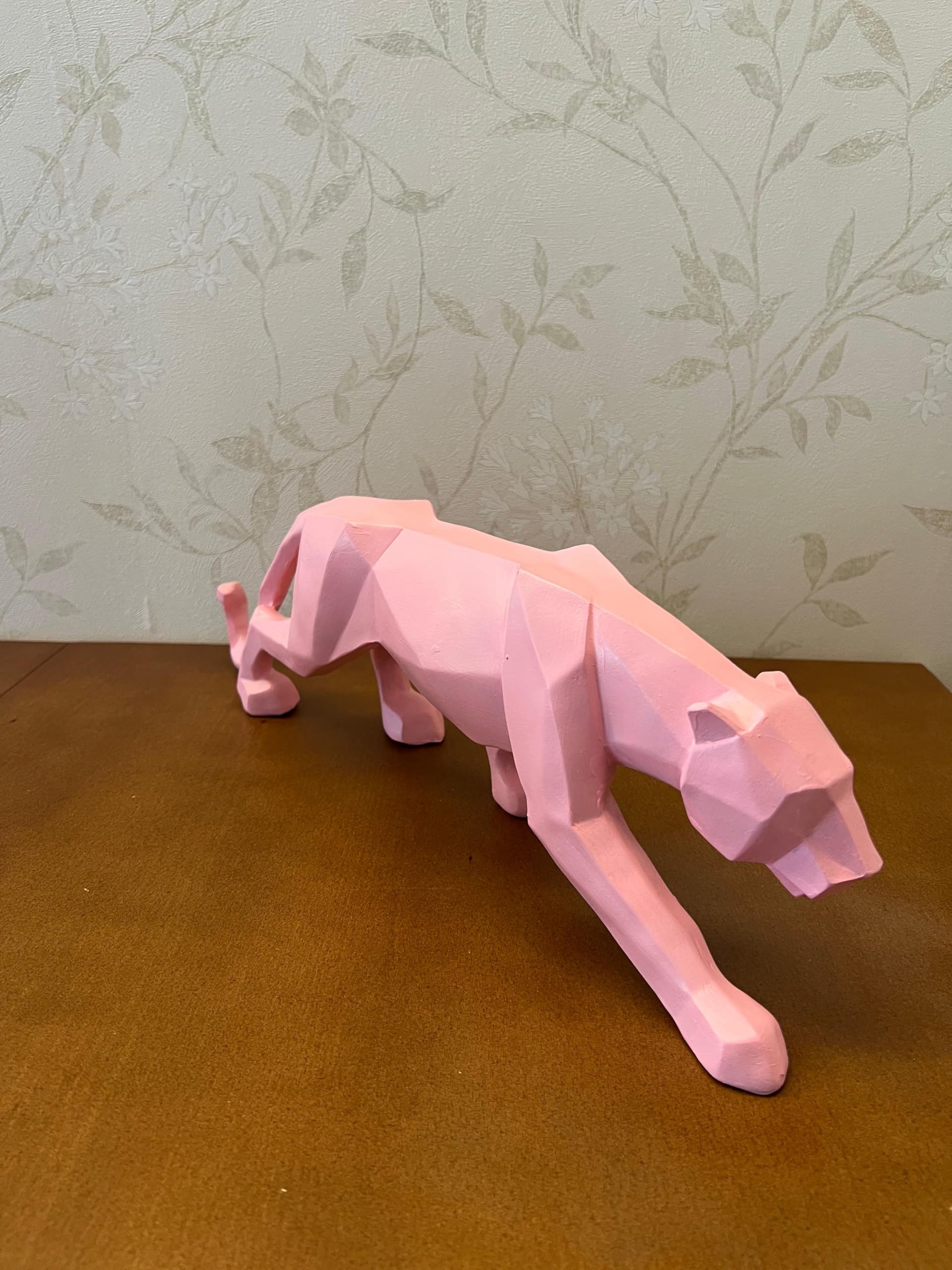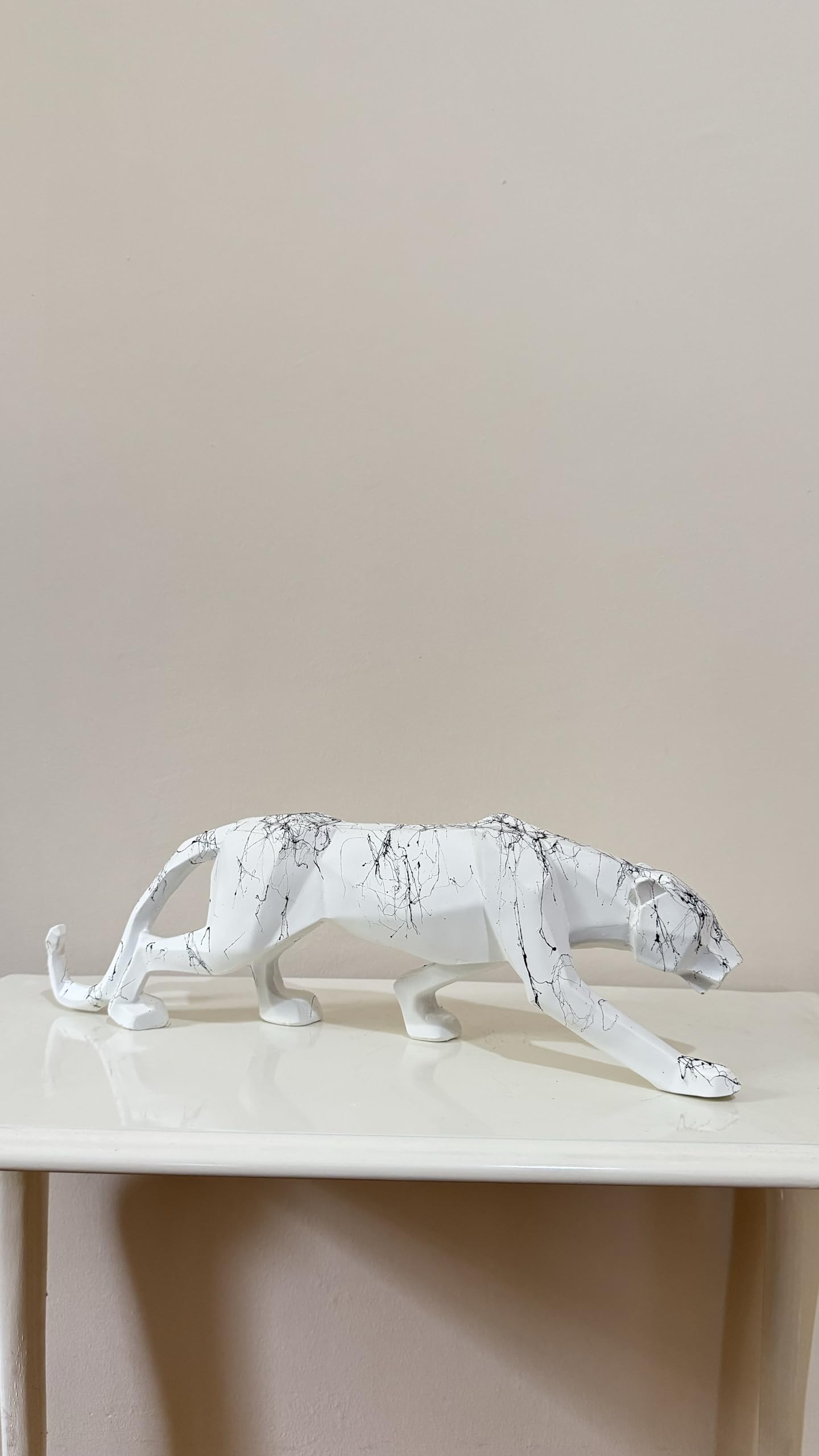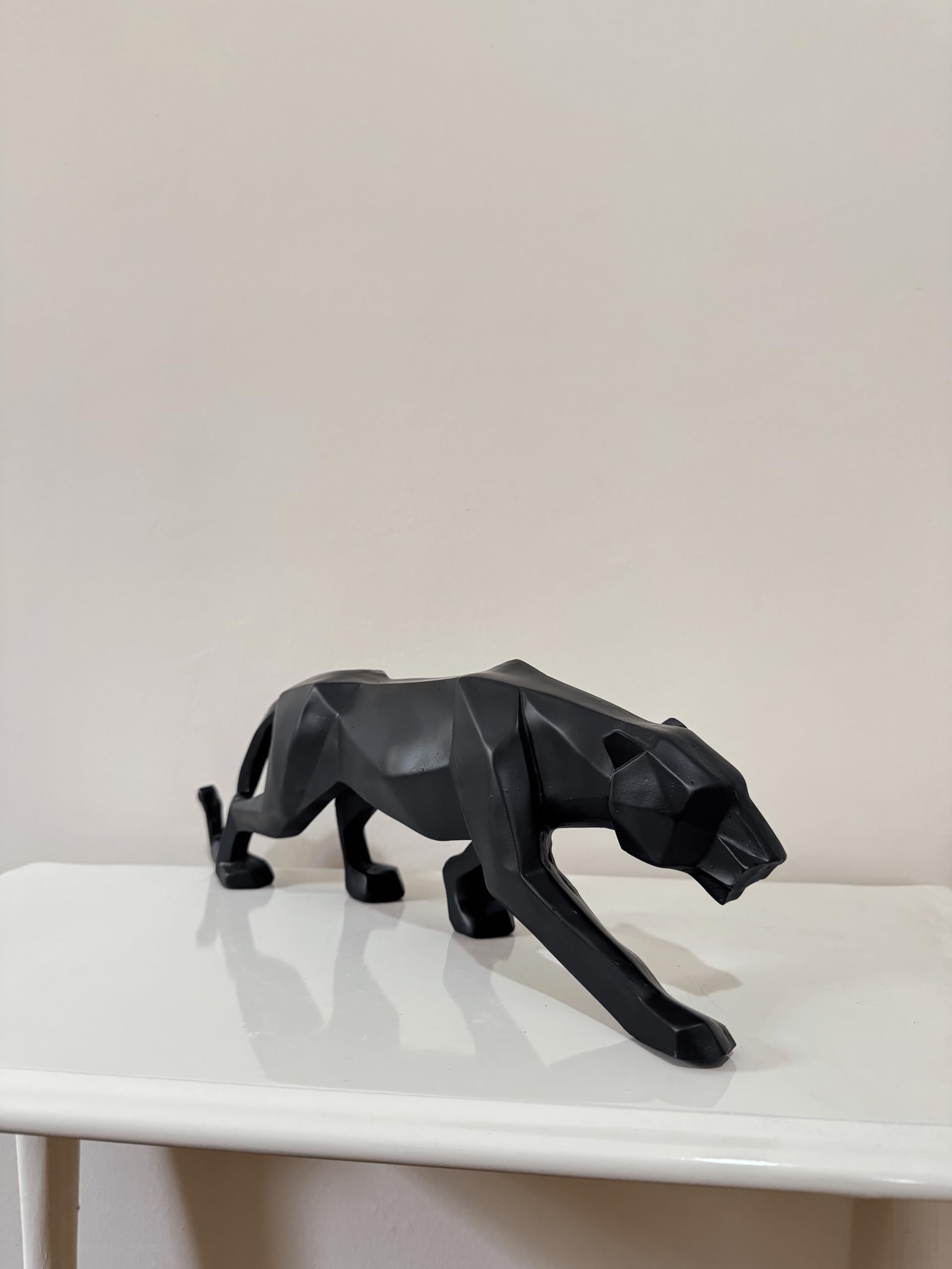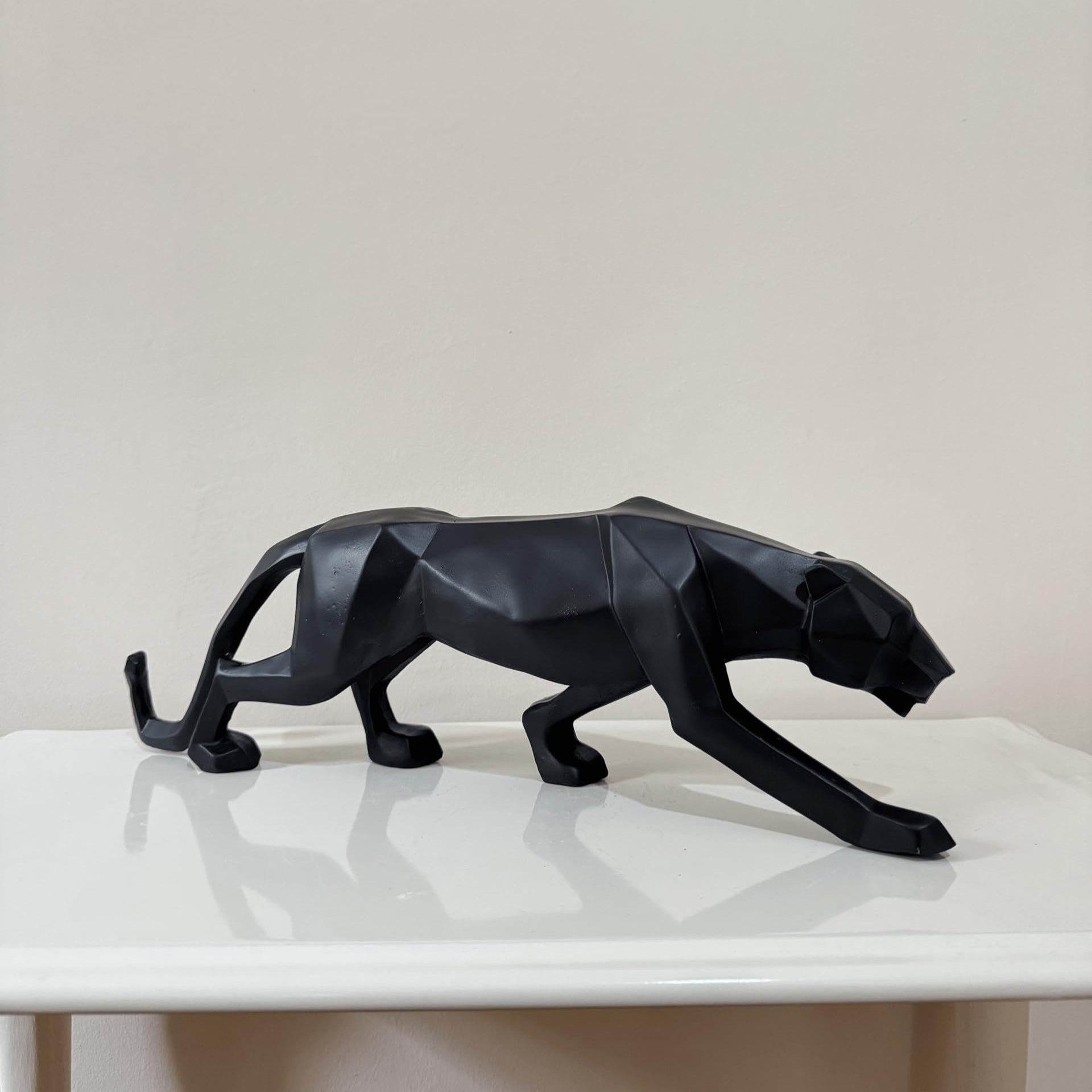 This is a geometric panther sculpture designed with a faceted, modern aesthetic. Crafted from high-quality polyester, this piece has a sleek matte finish that adds elegance and sophistication to any room.
