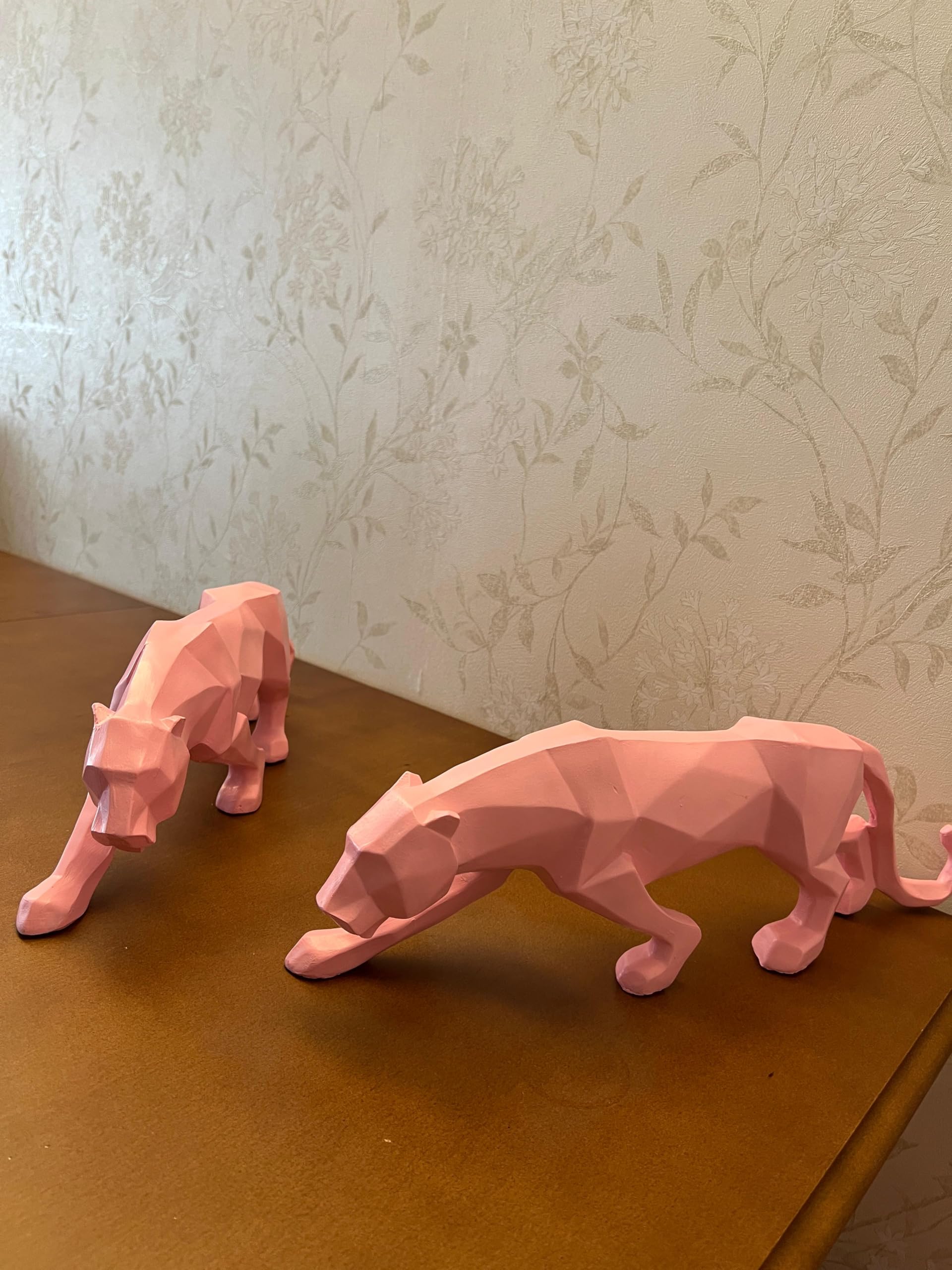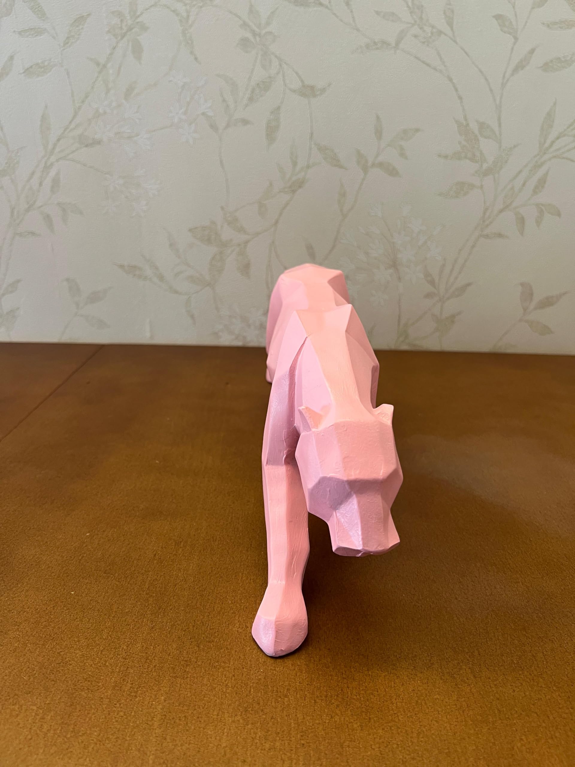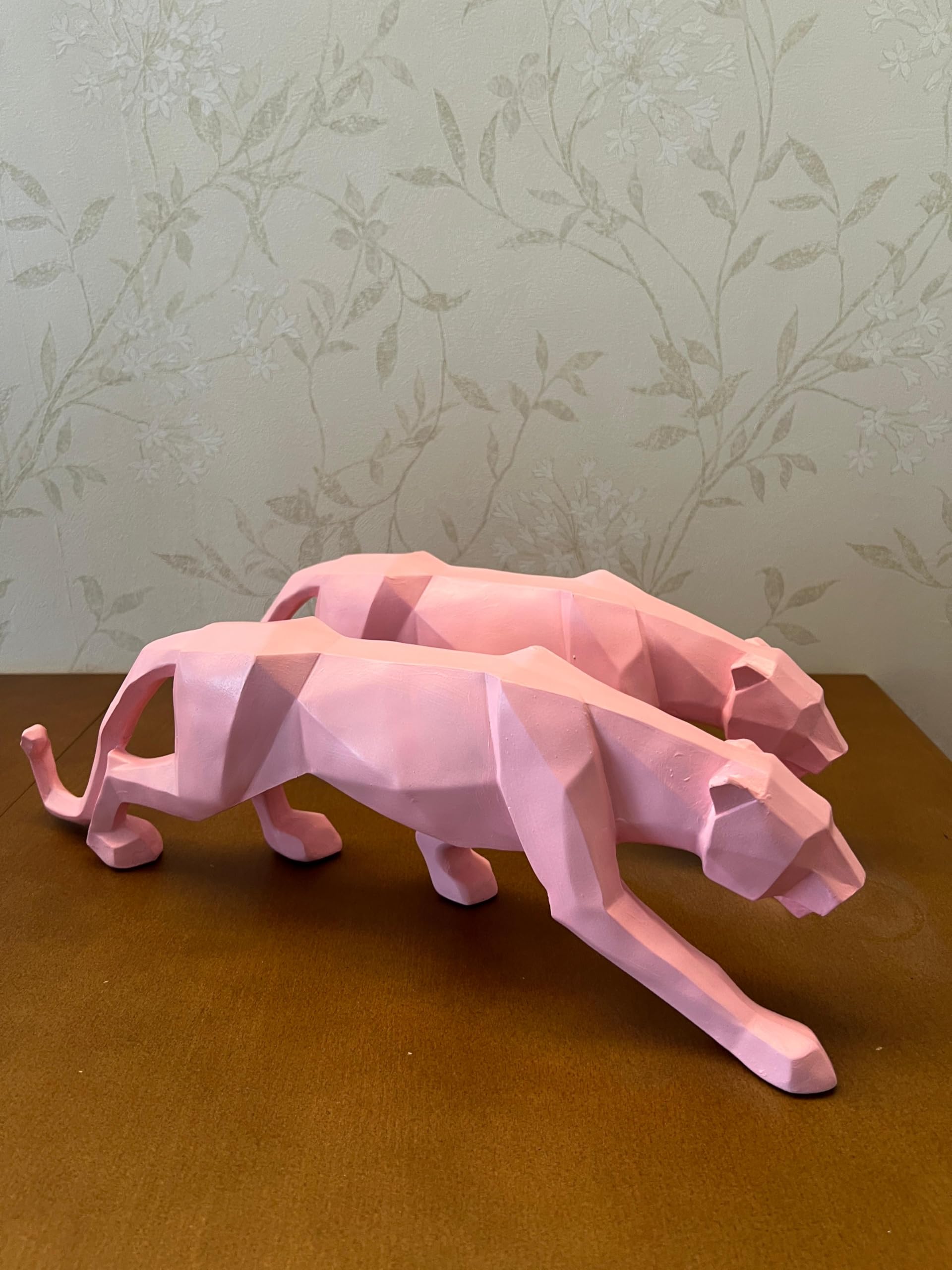 This is a geometric panther sculpture designed with a faceted, modern aesthetic. Crafted from high-quality polyester, this piece has a sleek matte finish that adds elegance and sophistication to any room.