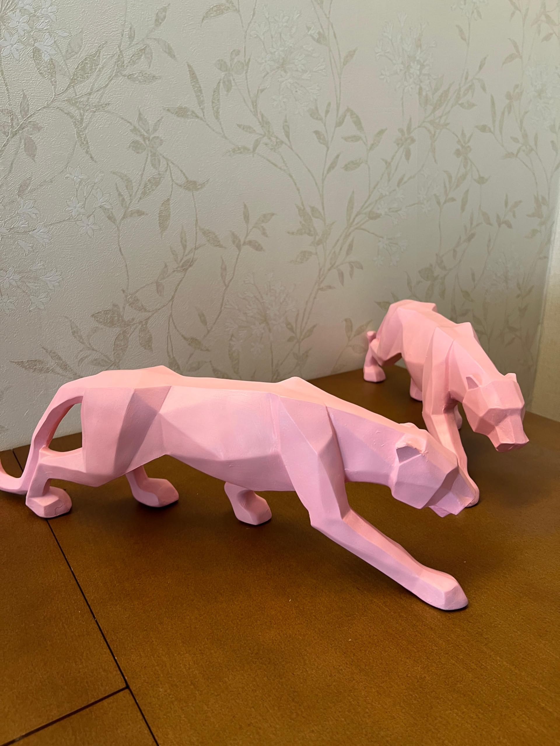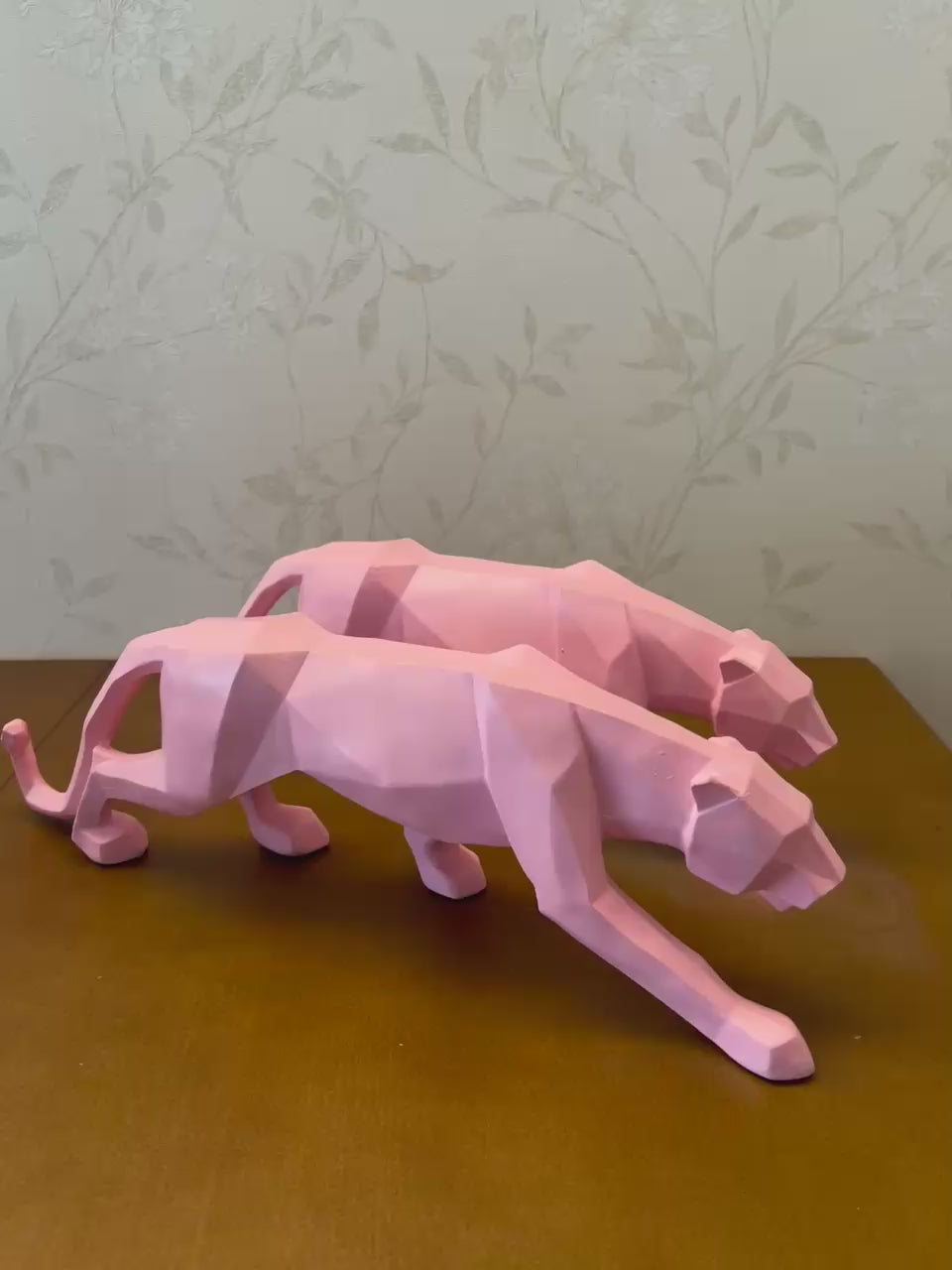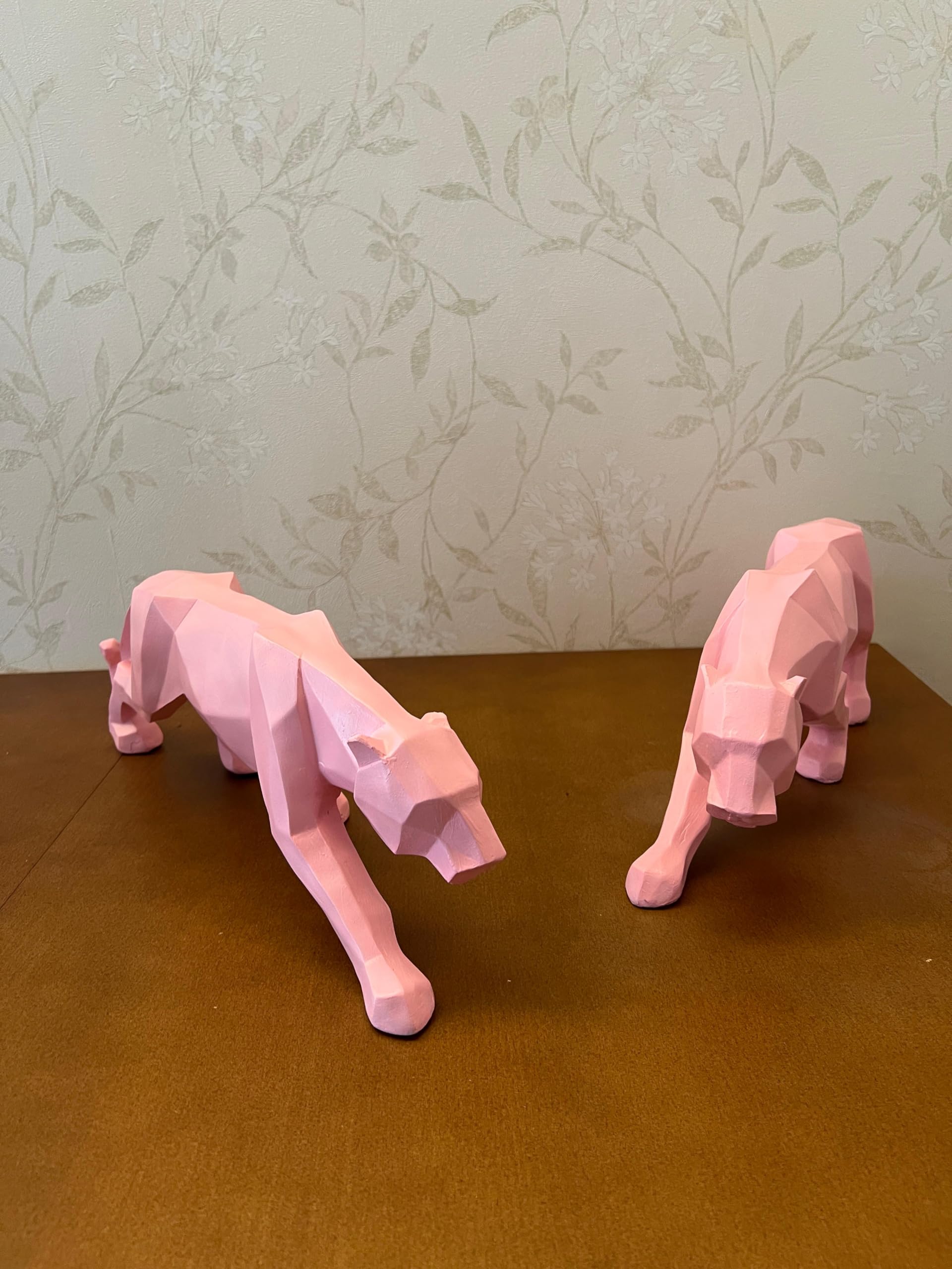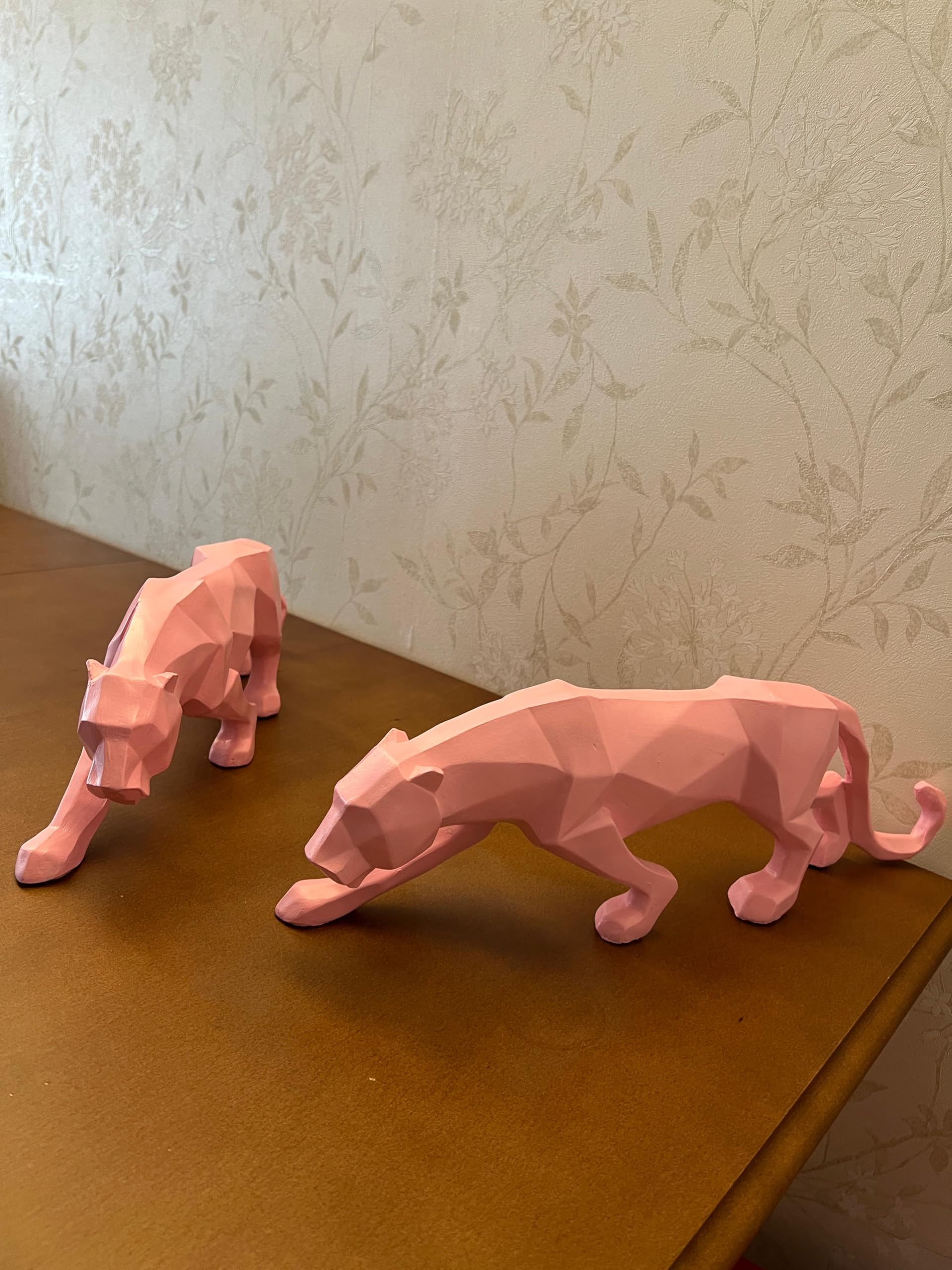 This is a geometric panther sculpture designed with a faceted, modern aesthetic. Crafted from high-quality polyester, this piece has a sleek matte finish that adds elegance and sophistication to any room.